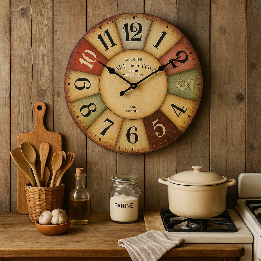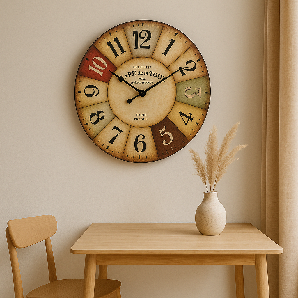 Design : Style vintage avec chiffres arabes noirs sur fond beige, sans verre ni cadre brillant.